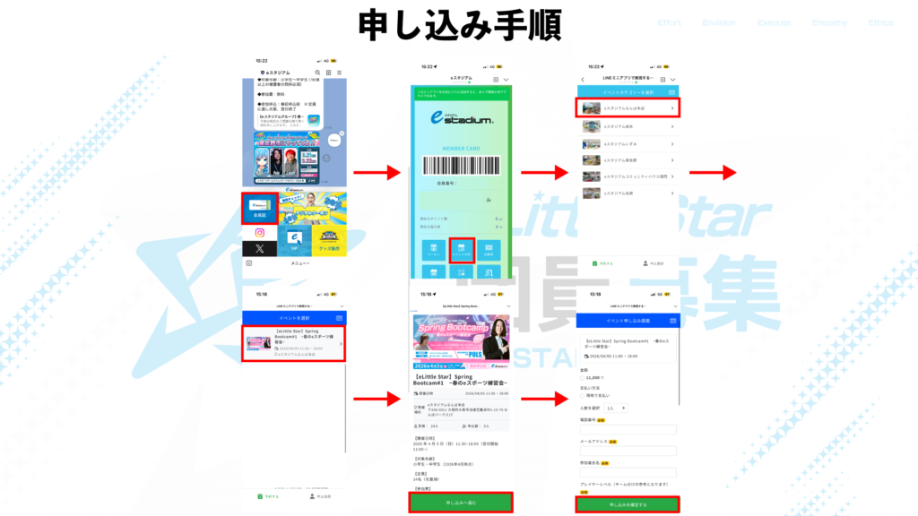 LINEのトークにイベント名や参加希望時間を送信しても、お申込みとはなりません。必ず下記手順に従ってお申込みをお願いいたします。